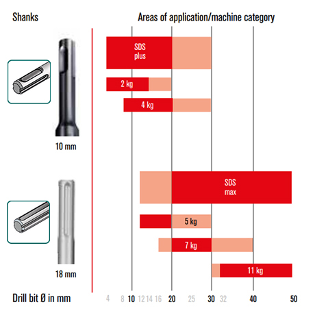 El sistema de sujeción rápida SDS es la conexión estándar de brocas de percusión consolidada en la actualidad. Garantiza la mejor transmisión de fuerza del sistema de perforación en caso de sujeción rápida, sencilla y segura de la broca en la taladradora. Dependiendo de la tarea, existe el formato más extendido, SDS-plus, con un diámetro de aprox. 10 mm para taladradoras de menos de 5 kg, así como SDS-max para taladradoras de más de 5 kg con un diámetro de aprox. 18 mm.